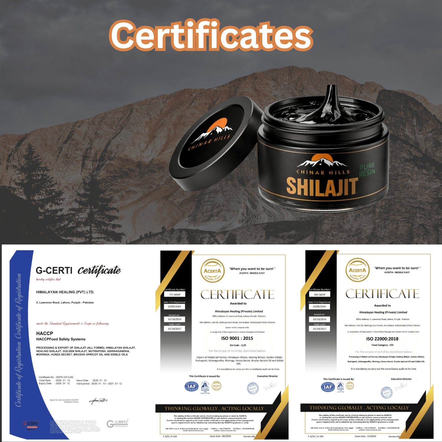 Chinar Hills Himalayan Shilajit Resin 30g is the only Shilajit resin in the USA backed by HACCP Food Safety, ISO 9001:2015 Quality Management, and ISO 22000:2018 Food Safety Management certifications — all internationally accredited through IAF-recognized bodies.